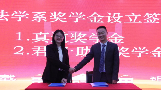 兰婷还分别与法学专业2005级校友、四川真道律师事务主任张黎冬,法学专业2008级校友、四川君溯律师事务所主任进行了“真道奖学金”和“君溯助航奖学金”签约仪式。颜勇代表法学系接受了捐赠。